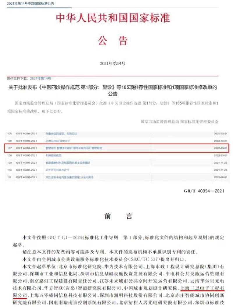 同時,三思還參與了包括國標《智慧城市 智慧多功能桿 服務功能與運行管理規范》在內的相關標準的起草和制定,共計10余項。