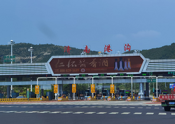 2020年,京滬高速公路萊蕪至臨沂(魯蘇界)改建項目正式通車。該項目路線全長超過232公里。全線主線采用雙向八車道高速公路標準改擴建。京滬高速公路南北線的全線貫通,為濟南的交通提供了便捷的路網管理模式。伴隨著夕陽余暉,行經濟南高速公路港溝收費站,懸于收費站門頭正中的2塊戶外全彩異形大屏(總面積300多㎡)顯得格外吸睛。這2塊戶外商顯正是由三思承建,清晰度極高,色彩鮮艷,可以循環顯示不同的品牌廣告,因其獨特的形狀構造和優質的顯示效果,得到了高度贊賞。